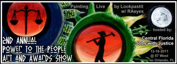 December, 16th, 2011 @ 57 West: This showcase was a live painting performance by Remmy Ar'emen (RAeyes) and myself (LookPastIt) to help in the fundraising to support Orlando Florida's Jobs With Justice campaign. Musiicians played music live and we painted live. Artworks were on auction throughout, and at the end, the artwork we painted was auctioned too. Proceeds went to Orlando Florida's Jobs with Justice.